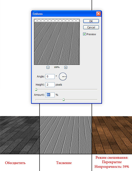 Шаг 8. Дублируем (CTRL+J) этот слой и обесцвечиваем его (CTRL+SHIFT+U). Применяем Filter - Stylize - Emboss (Фильтр - Стилизация - Тиснение) с параметрами, как на скриншоте ниже. Закончив, устанавливаем режим смешивания этого слоя на Overlay (Перекрытие) и уменьшаем Opacity (Непрозрачность) до 59%.