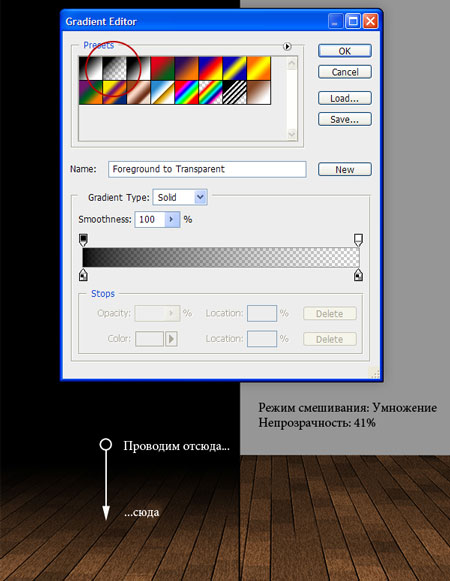 (Градиент) (G), чтобы добавить градиент, как показано ниже. Устанавливаем режим смешивания слоя на Multiply (Умножение) и Opacity (Непрозрачность) на 41%. Это сделает края немного темнее.