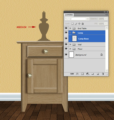 Шаг 26. Создаем новую группу "Лампа" и располагаем ее под группой "Комод". Рисуем базовую форму лампы и заливаем ее цветом #6B5A3E.