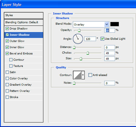 Шаг 39. Дублируем слой и очищаем все стили слоя, кроме Inner Shadow (Внутренняя тень). Немного корректируем параметры и уменьшаем Fill (Заливка) до 0%.