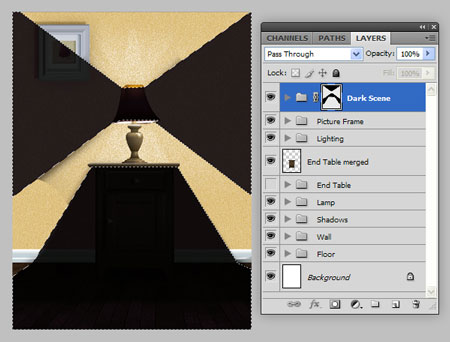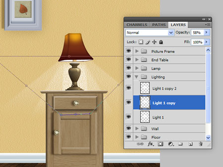 Шаг 41. Теперь мы поработаем со светом от лампы. Создаем новую группу "Освещение" над группой "Стена". Используем Polygonal Lasso Tool