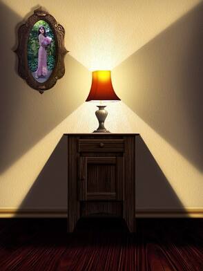 Шаг 47. На новом слое маленькой кистью (B) добавляем блики на краях рамки, верхней части комода и лампе. Таким же способом можете добавить теней в углах.