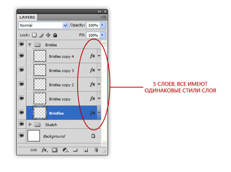 Шаг 4. Дублируем (CTRL+J) этот пустой слой 5 раз. Так как нам нужно нарисовать много щетинок, мы будем делать это на пяти отдельных слоях. Если рисовать все на одном слое, все штрихи смешаются и испортится весь эффект, который мы создали с помощью стилей слоя. Активируем нижний слой в группе и с помощью маленькой кисти рисуем линии.