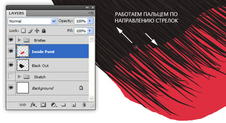 (Палец) (R) (100%) и проводим по краске в направлениях, указанных стрелками.