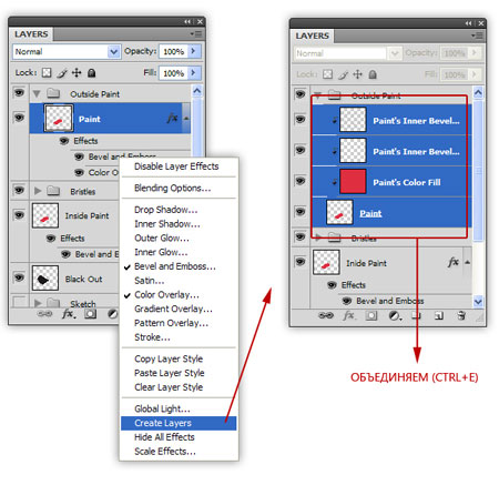 Шаг 11. Теперь мы должны объединить эффекты слоя с самим слоем. Для этого жмем правой кнопкой мышки по эффектам слоя "Краска" и выбираем Create Layers (Создать слои) (после этого они будут располагаться на отдельных слоях). Затем выделяем необходимые слои и жмем CTRL+E.