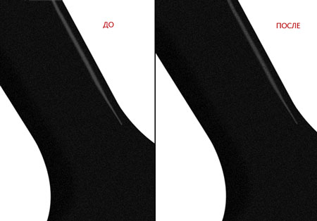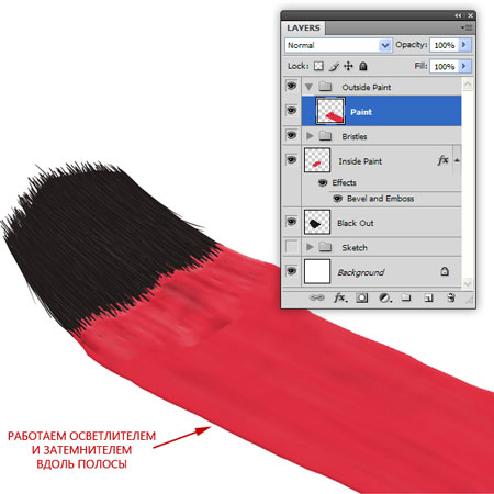 (Затемнитель) (О), чтобы добавить тени и блики на полосу. Закончив, объединяем этот слой со слоем "Краска".