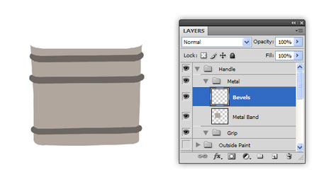 Шаг 21. Теперь, когда работа с щетиной и краской закончена, мы можем начать создание остальной части кисти. Скрываем все слои с щетиной и краской. Затем создаем новую группу "Ручка". Внутри группы создаем две новые группы "Металл" и "Держатель".