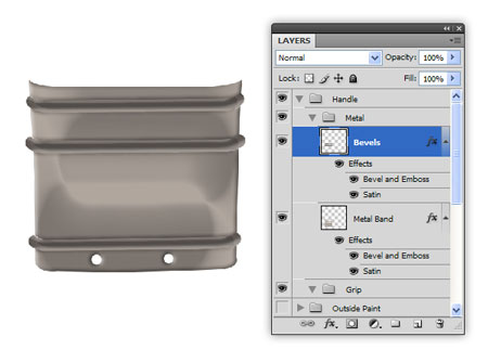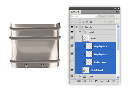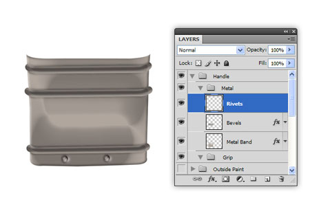 Шаг 27. Теперь, чтобы следующий шаг был простым, объединяем слои "Заклепки" и "Фаска". Затем объединяем слой "Металлическое кольцо" с его стилями слоя, как мы делали это в шаге 11.