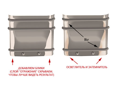 Шаг 29. Создаем еще один слой "Блики 1" и преобразовываем его в обтравочную маску. Используя светлый цвет, рисуем блики. Затем с помощью Burn Tool