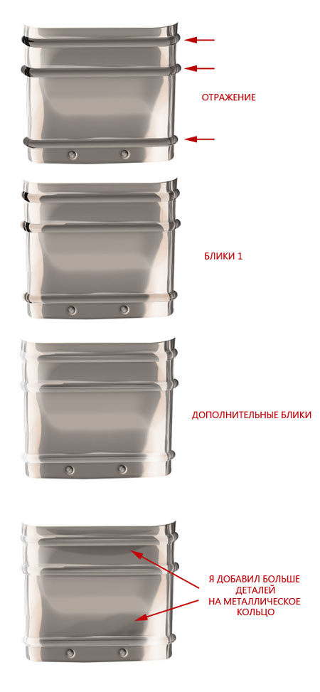 Шаг 31. Теперь используем этот же метод и добавляем блики и отражения на ободках кольца. Закончив, добавляем еще несколько теней и бликов, как показано ниже.