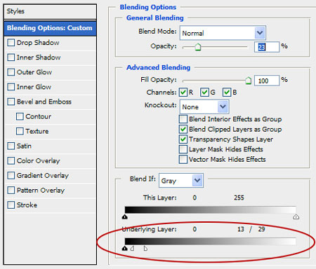 Шаг 17. Переходим к стилям слоя и корректируем параметр Blend If: Underlying Layer (Наложить если: Нижележащий слой).