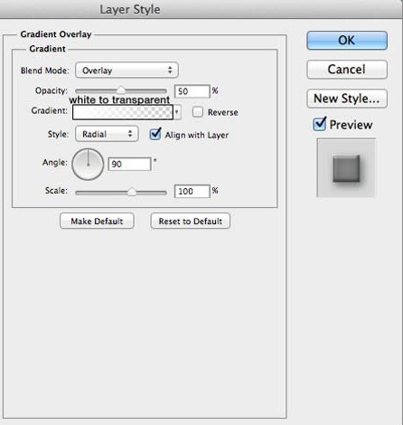 Кликните дважды на фоновом слое, чтобы разблокировать его. Затем кликните дважды ещё раз, чтобы открыть окно стилей. Примените Наложение градиента (Gradient Overlay):