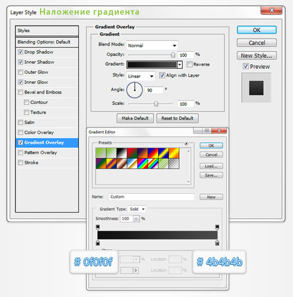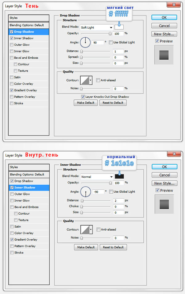 Откройте окно настроек Стиль слоя (Layer Style), для этого прямоугольник с закруглёнными углами, и введите значения, показанные на картинках.