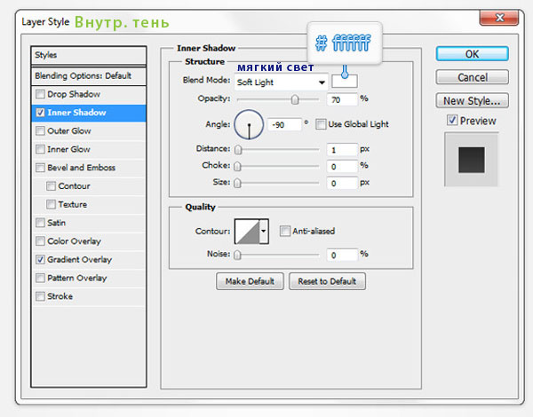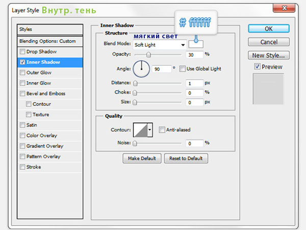 Добавим к полученной фигуре Стиль слоя (Layer Style). Настройки вы можете просмотреть ниже.