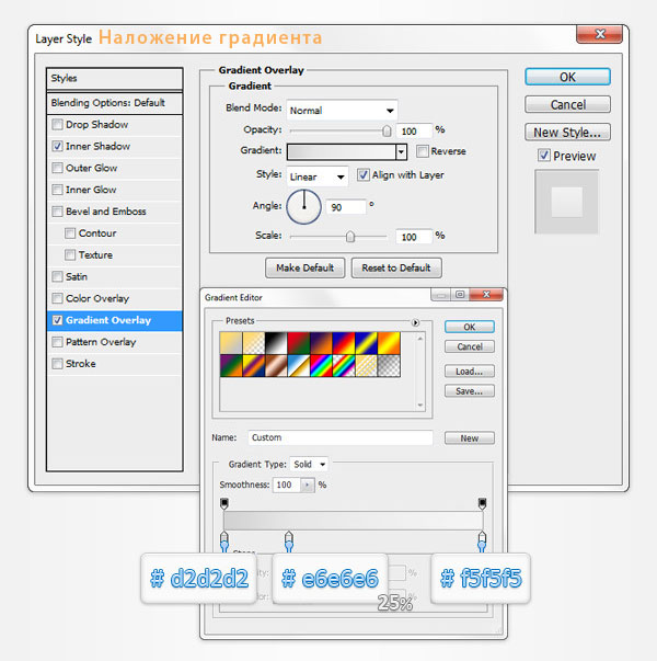 Сделайте двойной щелчок по слою с белой трапецией для перехода к панели Стиль слоя (Layer Style). Откорректируйте вкладку Наложение градиента (Gradient Overlay) - измените цвет градиента. Установите цвет от темно-серого к белому. При необходимости понизьте непрозрачность градиента до 50%.
