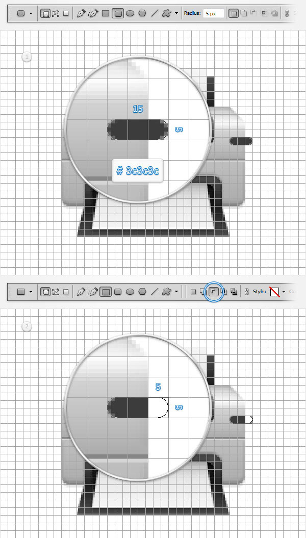 (Rounded Rectangle Tool). Создайте элемент размером 6 х 3 пикселя и поместите его, как показано на первом изображении ниже.