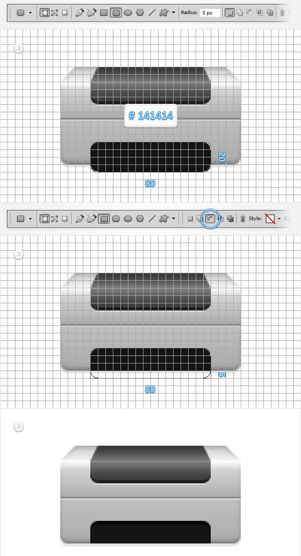 (Rounded Rectangle Tool). Нарисуйте фигурку размером 80 х 20 пикс. и разместите ее по центру верхней части принтера.