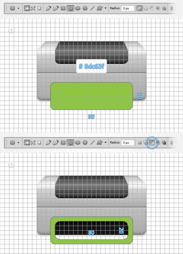 (Rectangle Tool) и нарисуйте фигуру размером 90 х 20 пикс.. Данная фигура послужит полочкой принтера.