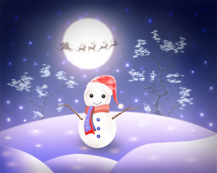 (custom shape tool), в наборе фигур, выберите фигуру Санты. Установите цвет чёрный. Щёлкните кистью по небу, и, удерживая кнопку мыши, немного проведите кистью по небу, чтобы создать фигуру. Во время создания фигуры, не забудьте удерживать клавишу (Shift). (Примечание переводчика: автор создаёт небольшой эффект динамики). Расположите фигуру Санты поверх изображения Луны. Растрируйте слой с Сантой, а также уменьшите Непрозрачность (opacity) слоя до 40%.