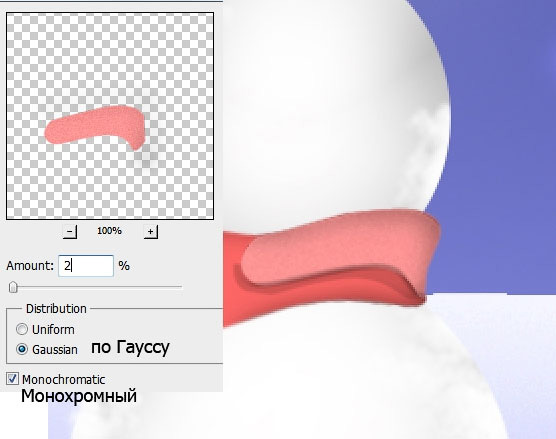 Выделите деталь шарфа, а затем идём Фильтр – Шум – Добавить шум (filter > noise > add noise), чтобы добавить немного шума: