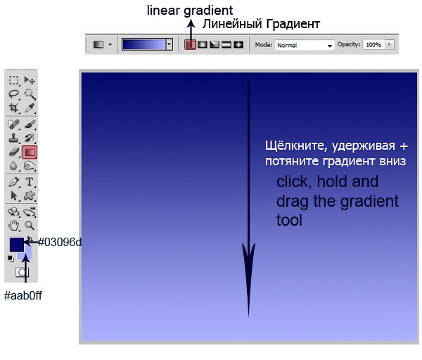 (gradient tool (G)). Установите цвет переднего плана на #03096d, а цвет заднего плана на #aab0ff. В настройках инструмента Градиент установите Линейный градиент (linear gradient). Щёлкните в верхней центральной части изображения, удерживая градиент, потяните его вниз до нижней части изображения, чтобы залить рабочий документ выбранным градиентом.