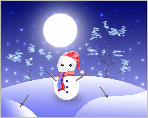 Далее, мы добавим сугробы к нашей сцене. Создайте новый слой, нарисуйте фигуры сугробов, залив их тем же самым градиентом, который мы использовали в Шаге 4: