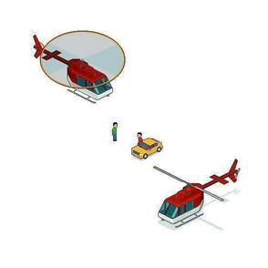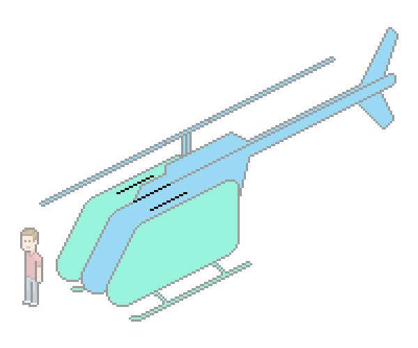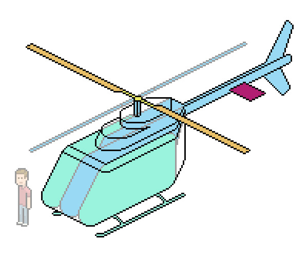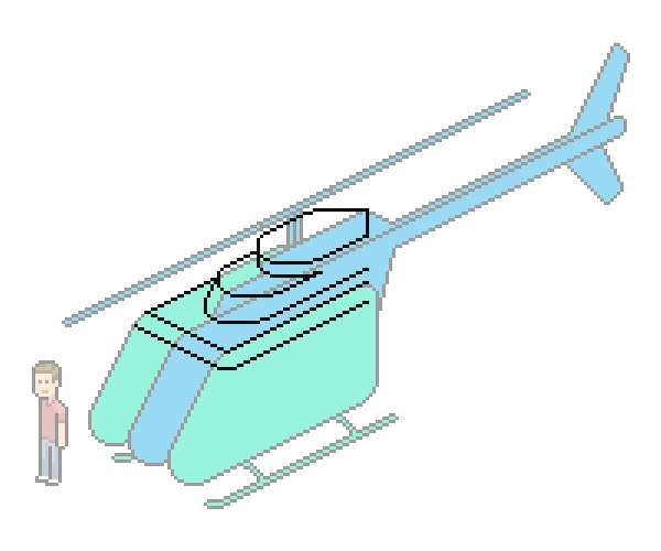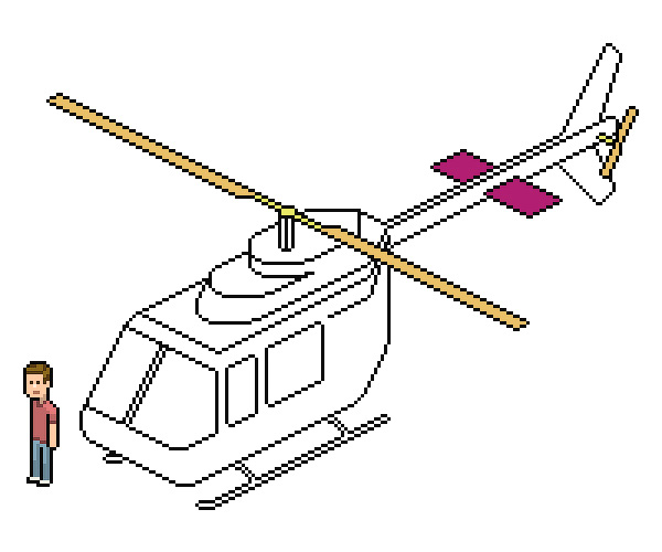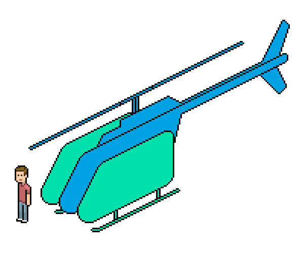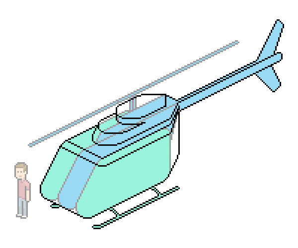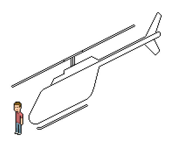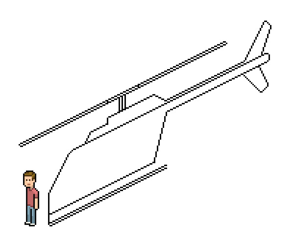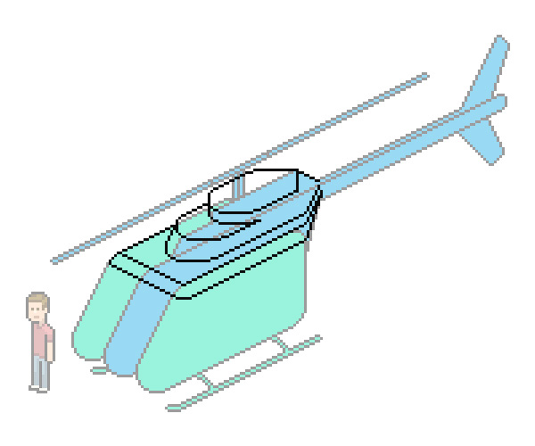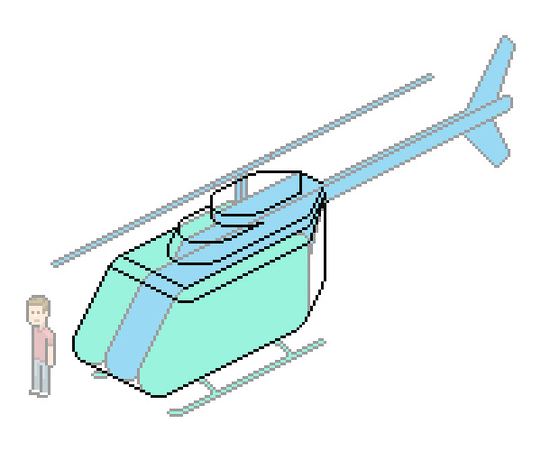 Вертолет должен быть примерно в два раза выше человека. Пропорции не обязательно делаются слишком реалистичными; в конце концов, обычно лучше, когда транспорт и здания немного меньше. Таким образом, человек остается видимым и важным элементом на больших, более сложных композициях.