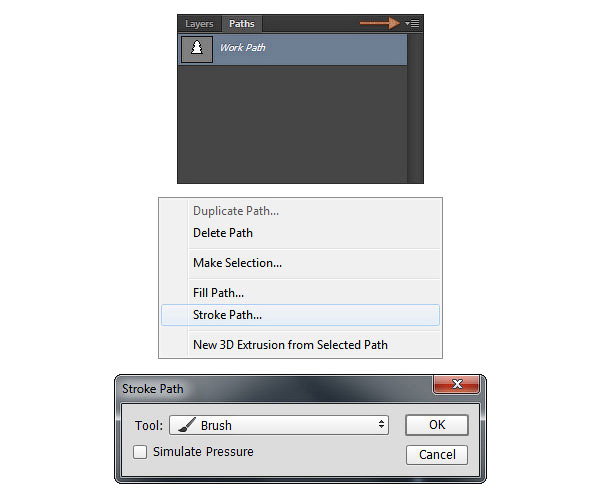 В панели слоёв создайте новый слой. Теперь, перейдите в закладку Контуры (Paths), если закладка не активна, то идём Окно – Контуры (Window > Paths), щёлкните на значок в правой верхнем углу и в появившемся меню, выберите опцию Выполнить обводку контура (Stroke Path), установите кисть в качестве инструмента обводки, а затем нажмите клавишу ‘Enter’.