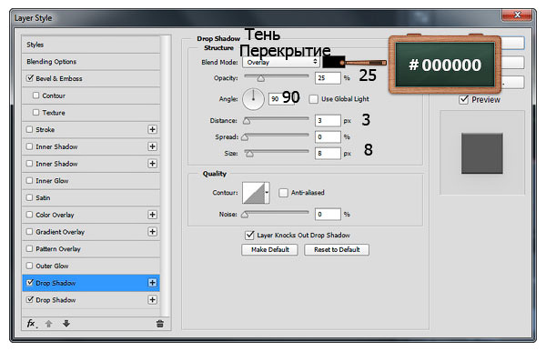 К слою, который мы создали в предыдущем шаге, примените стили слоя. Установите настройки для стилей слоя, которые указаны на скриншотах ниже.