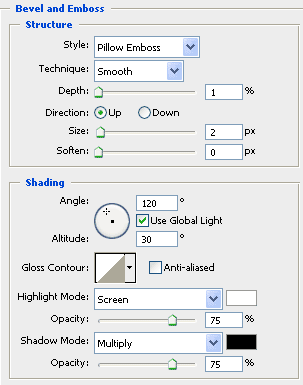 Шаг 12. Откройте функцию Layer Style «Стили слоя» и выберите команду Bevel and Emboss «Тиснение». Все значения поставьте, как на рисунке: