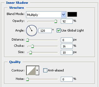 Шаг 9. Теперь откройте функцию Layer Style «Стили слоя», и выберите команду: Inner Shadow «Внутренняя тень». Значения внутренней тени поставьте такие, как видите на рисунке: