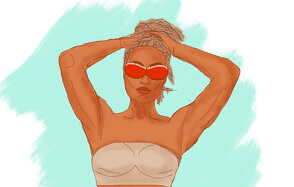 Доработал волосы, изменил форму купальника и почти полностью стер лайн.