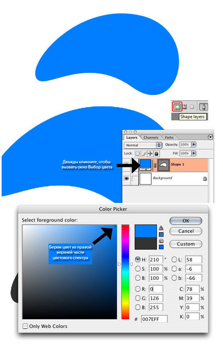(Перо) (P) в режиме shape layers (слой фигура), создадим абстрактную форму, которую вы видите на рисунке ниже. Меняем цвет формы, дважды кликнув по миниатюре слоя, на голубой #017eff.