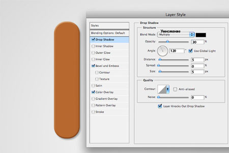 Шаг 4. Кликаем правой кнопкой мышки по слою с фигурой и выбираем Blending Options (Параметры наложения). С помощью стиля слоя Color Overlay (Перекрытие цветом) поменяем цвет на коричневый.