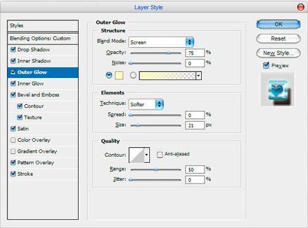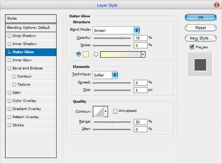 ОК, теперь сольём все 3 слоя вместе (Ctrl+Е) и добавим этому объединённому слою стиль Outer Glow (Внешнее свечение): режим Screen (Осветление), цвет # ffffbe