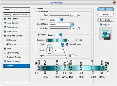 Stroke (Обводка) – положение Center (По центру), режим Normal (Нормальный), Fill Type (Тип обводки) – Gradient (Градиент), стиль градиента Liner (Линейный), цвета: #daeaea, #014556, #54a1ac, #cdfffe, #4e9fa9, #cdfcff, #73cdd7, #025c61, #c7fdff