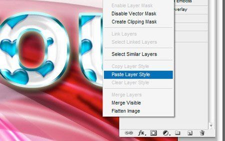 После этого идём на слой с сердечком, щёлкаем правой кнопкой мыши на слой, в выпадающем меню выбираем Paste Layer Style (Вклеить стиль слоя)