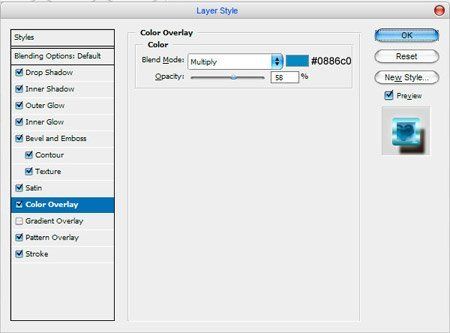 Смотрится довольно хорошо, не правда ли? Но мне хотелось бы изменить цвет сердца, чтобы оно отличалось от текста. Добавляем Color Overlay (Наложение цвета) в стиле слоя: Color (Цвет) #0886c0, режим Multiply (Умножение).