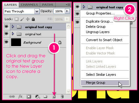 Теперь нажмите на иконку группы и тащите её вниз палитры слоёв на значок New Layer (Новый слой), чтобы дублировать её. Правый клик на дубликат группы и выбираем Merge Group (Объединить группу).