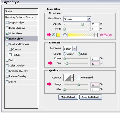 - Inner Glow (Внутреннее свечение): цвет #fff43e, Size (Размер) 10 пикс., Range (Диапазон) 60%.