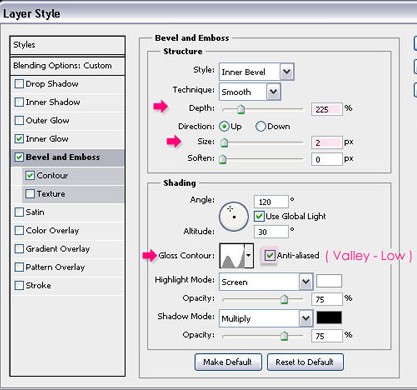 - Bevel and Emboss (Тиснение и скос): измените Depth (Глубина)на 225%, Size (Размер) 2 пикс., Gloss Contour (Контур глянца) поставьте Valley – Low (Долина-Низкая). Также необходимо поставить галочку напротив Anti – aliased (Сглаживание).