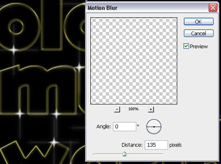 Потом перейдите на слой «Horizontal Blur», и примените к нему тот же фильтр Filter -> Blur -> Motion Blur(Фильтр-Размытие-Размытие в движении) со следующими настройками: Angle (Угол) 0 градусов, Distance (Смещение) 135 пикс.