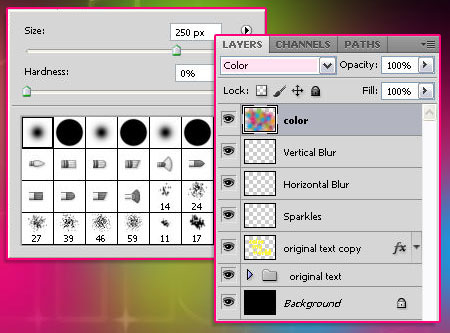 Когда Вы закончите со звёздочками, сделайте два дубликата слоя «Sparkles», и переименуйте один из них в «Vertical Blur», другой – в «Horizontal blur». Переместите их выше слоя «Sparkles».