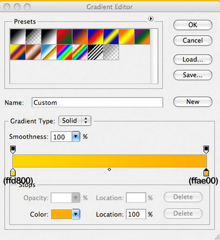 (Gradient Tool) (G): Стиль (Style) – Радиальный (Radial), цвета: от #ffd800 к #ffae00. Залейте фоновый слой.