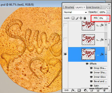 Создайте четыре копии, как мы это делали для медового текста, но используйте другие настройки стилей слоя для самой нижней копии.