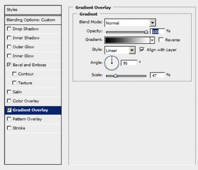 К слою с буквой примените стиль Наложение градиента (Gradient Overlay) (кликните на иконке fx в нижней части палитры слоёв, чтобы получить список стилей).