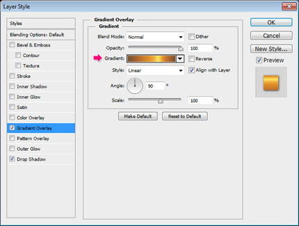 Еще один небольшой совет: при изменении "Наложение градиента\Gradient Overlay", просто щелкните и перетаскивайте градиент внутри ленты, таким образом вы легко будете менять вид градиента.