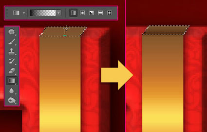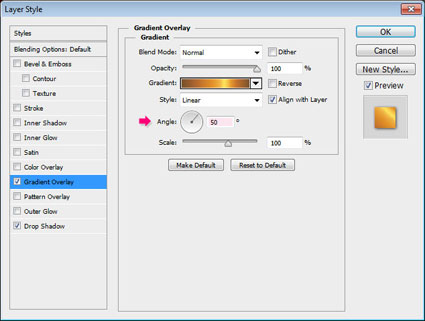 Дважды щелкните на дубликат слоя с лентой, а затем измените угол в закладке "Наложение градиента\Gradient Overlay" на "0" (в соответствии с угла новой фигуры).
