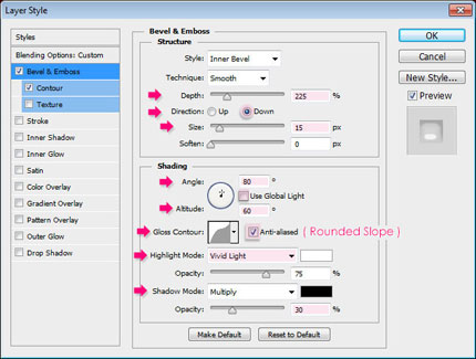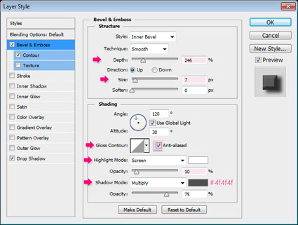 Двойным кликом левой кнопки мыши, по слою с оригинальным текстом, откройте панель "Стиль слоя\Layer Style". Установите такие параметры: