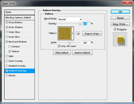 Добавим простой узор для Наложения узора (Pattern Overlay), используя картинку с блеском. Автор, например, выбрал золотой узор из удивительного набора блестящих Бесшовных узоров. Большой выбор узоров есть здесь.